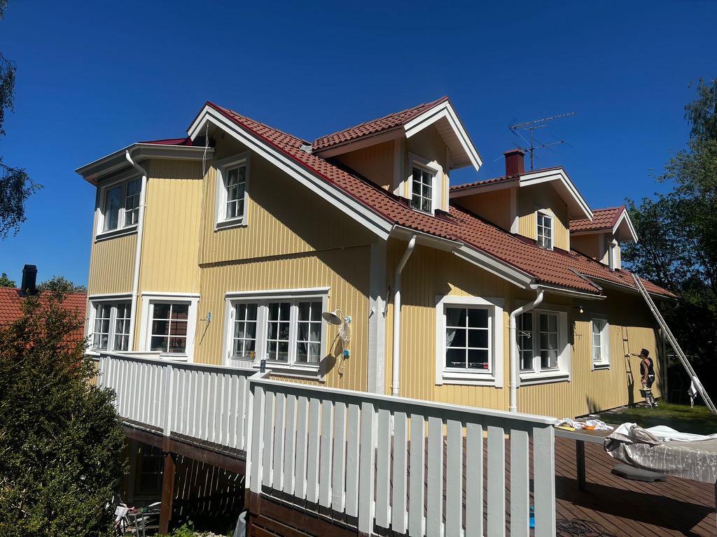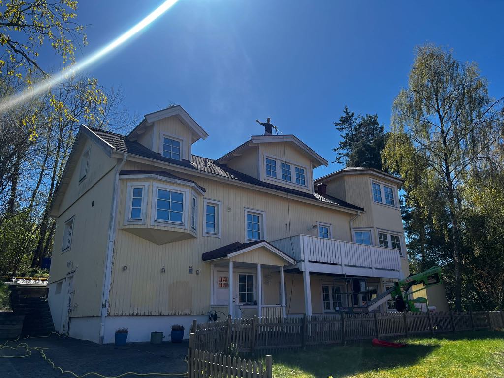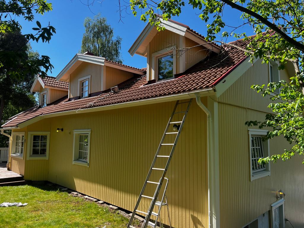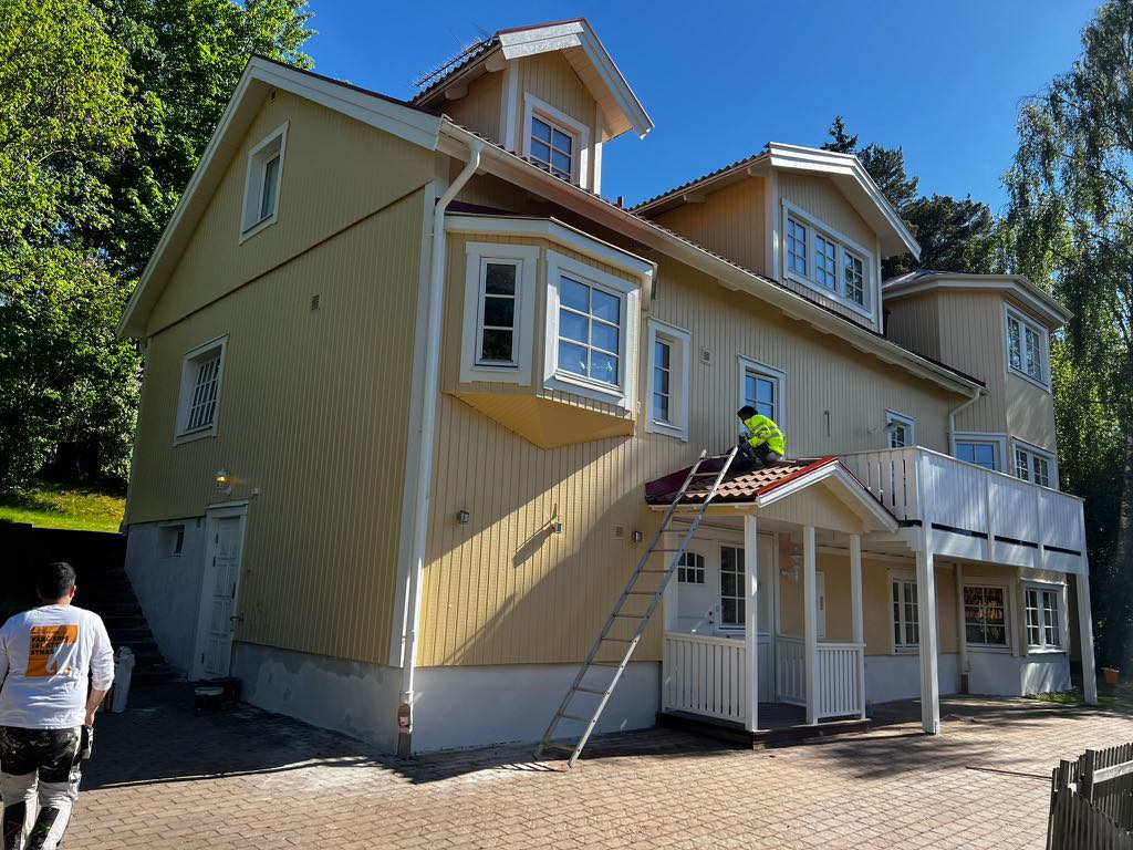 På detta arbete har vi först tvättat och rengjort taket och fasaden noggrant. Därefter påbörjades grundmålningen.