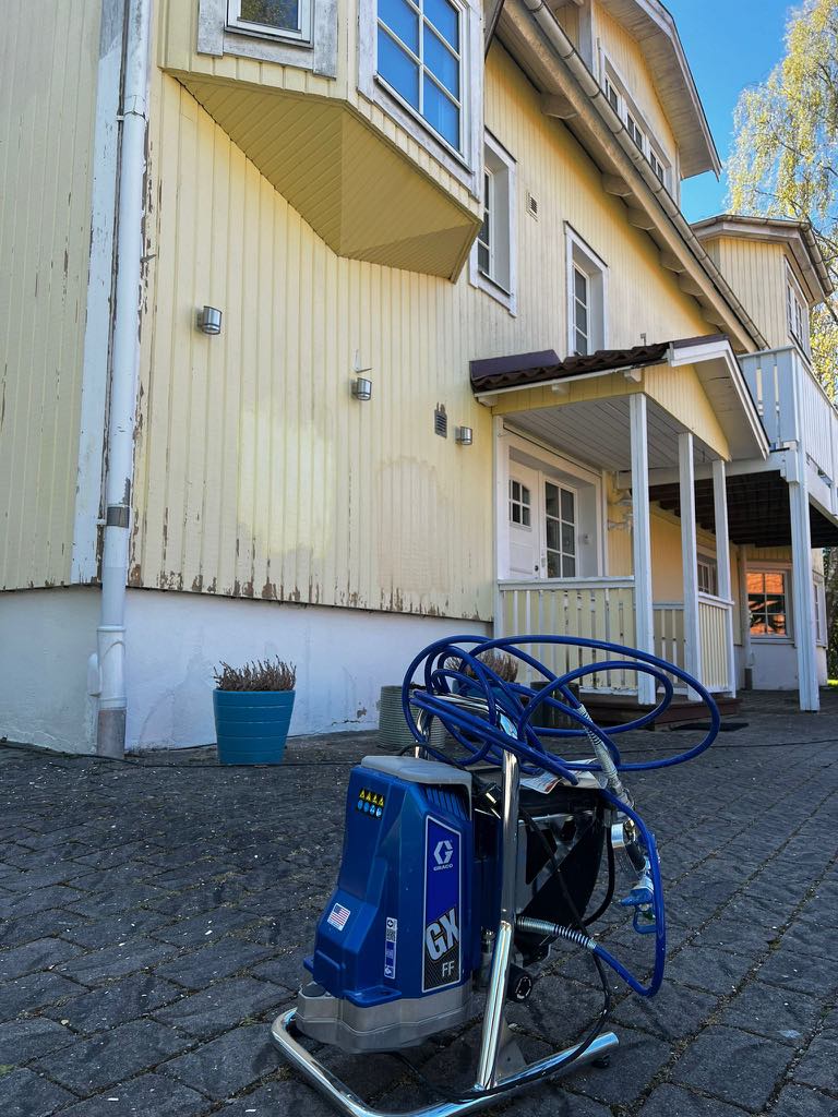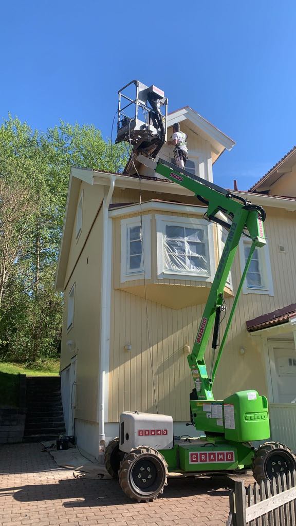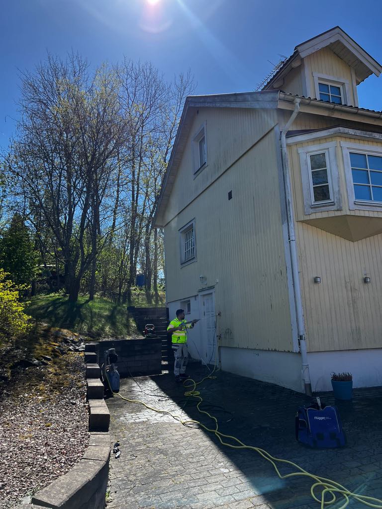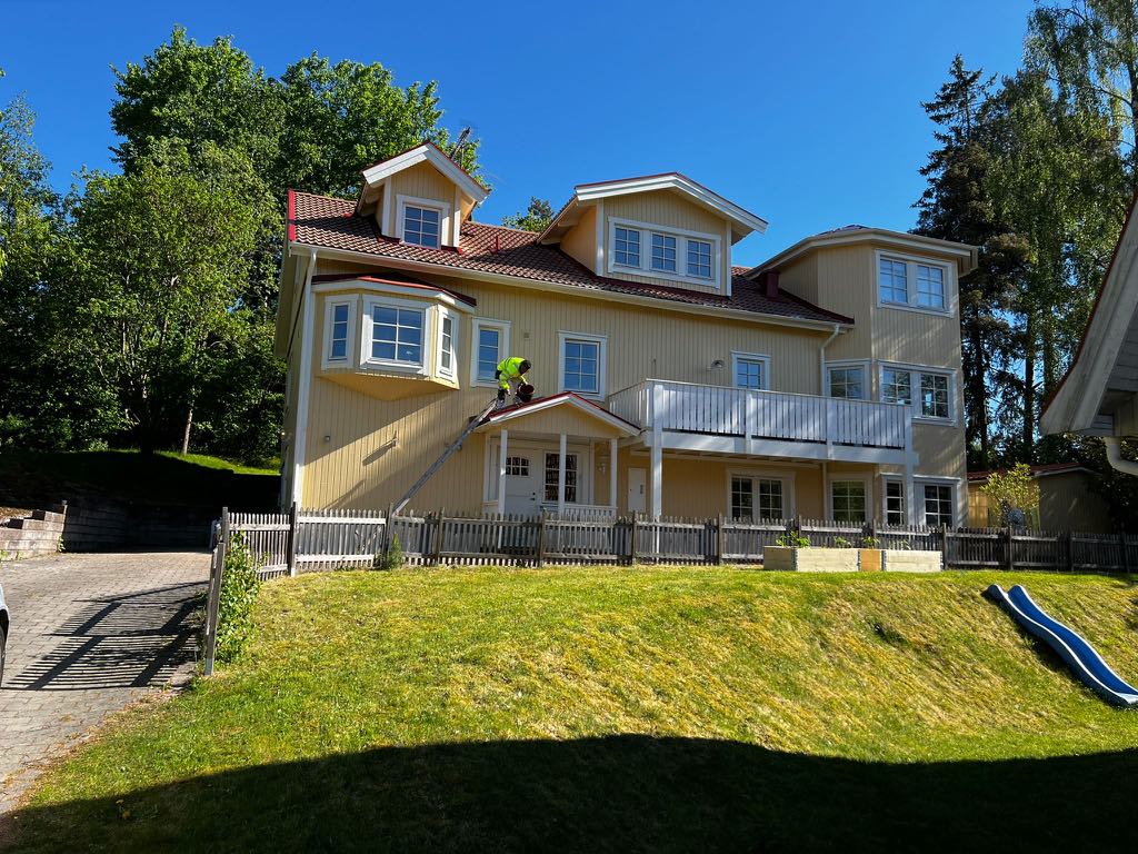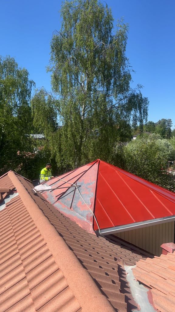 På detta arbete har vi först tvättat och rengjort taket och fasaden noggrant. Därefter påbörjades grundmålningen.