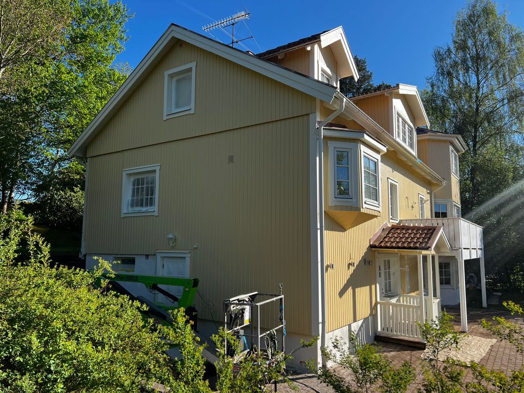 Efter att grundmålningen var klar, fortsatte vi med att måla själva fasaden. Vidare målade vi vindskivorna och fönsterfodren för att ge en enhetlig och snygg finish. Kuporna fick också ett nytt lager färg för att förbättra utseendet och skyddet mot väder och vind. Slutligen målade vi alla metalldelar på taket, inklusive eventuella detaljer och beslag, för att säkerställa ett komplett och hållbart resultat.