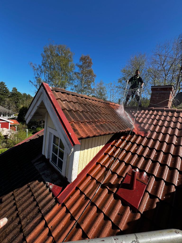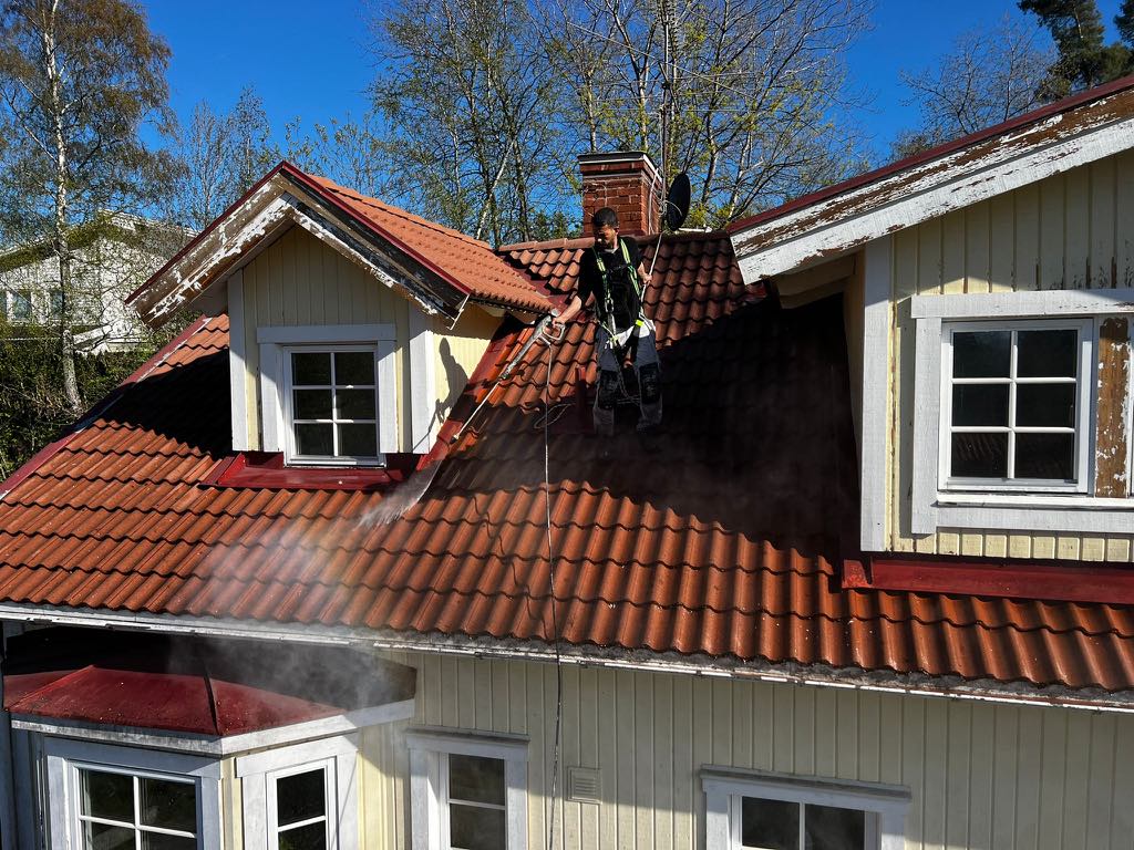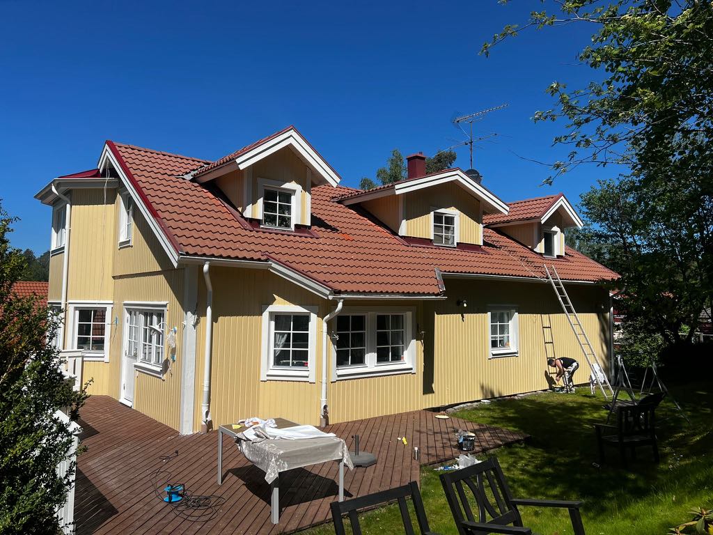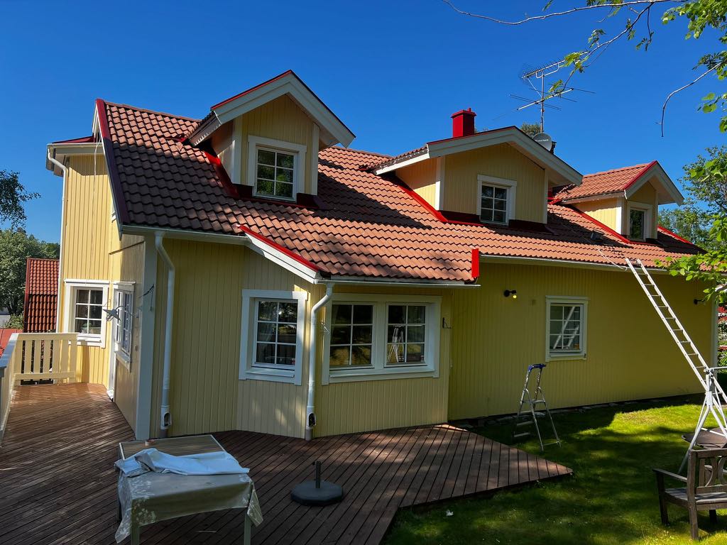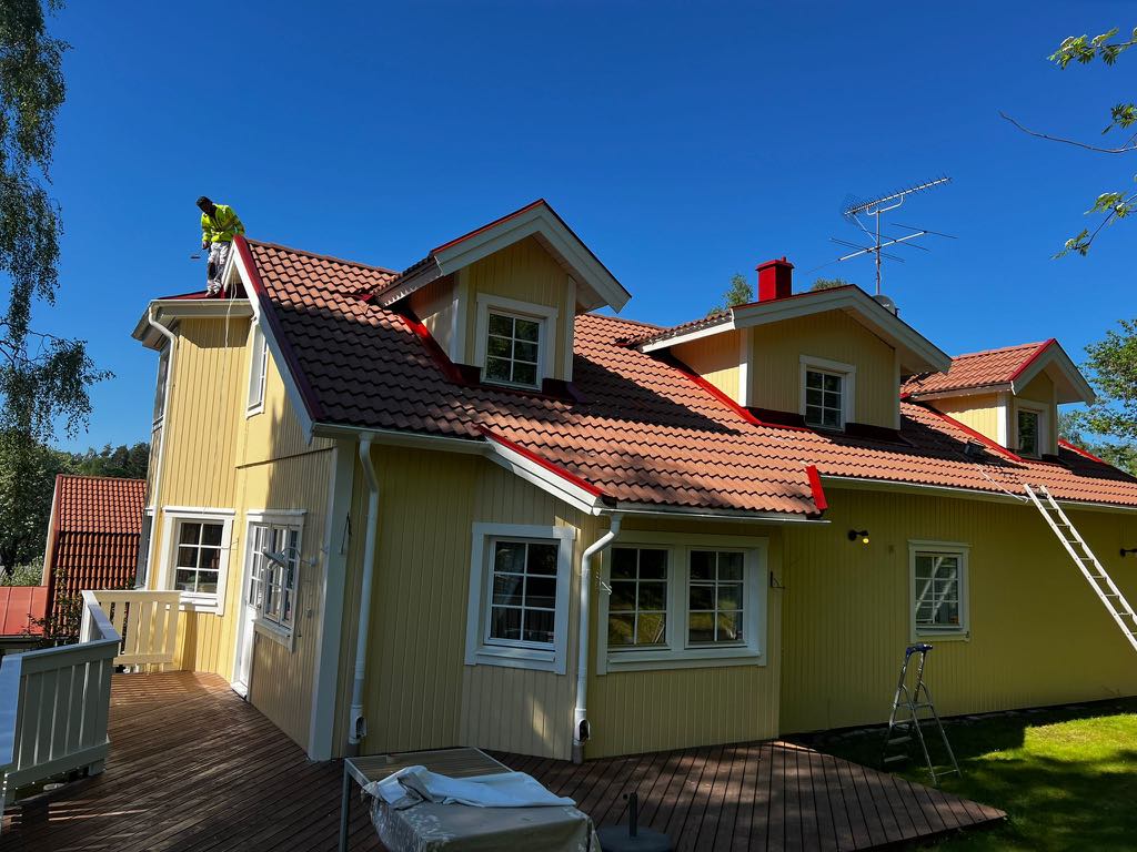 Först tvättade och rengjorde vi taket och fasaden grundligt för att avlägsna smuts, mögel och annan beläggning som kunde påverka slutresultatet negativt. Därefter påbörjades grundmålningen, som är en avgörande förberedelse för att färgen ska fästa ordentligt och hålla länge.